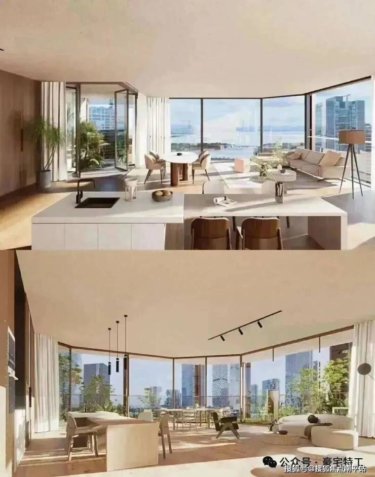 项目规划5栋超高层住宅,采用全玻璃幕墙设计,实用率超95%,主力户型为209㎡以上大平层。项目以“第四代住宅”标准打造,配备空中连廊、星空会所、架空泳池等共享空间,并融入垂直绿化体系