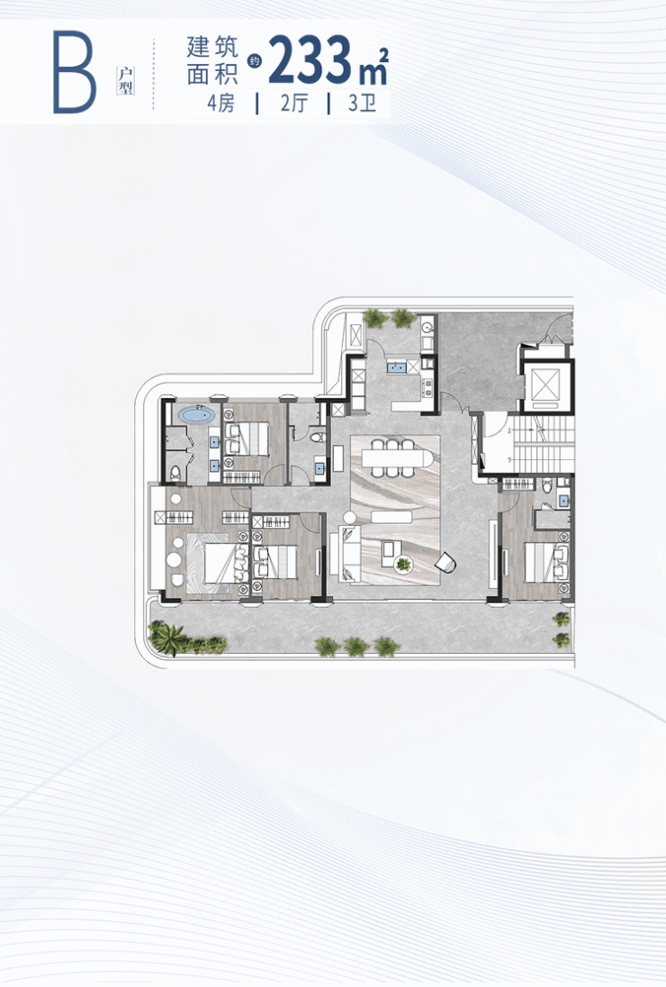 比如建面约233㎡户型,南北通透,19m阳台联通4开间!