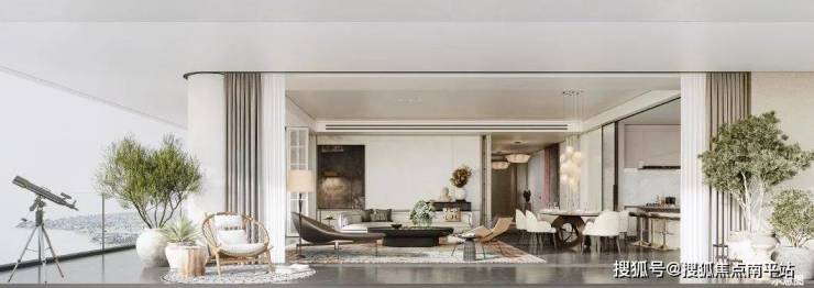步入室内,就是约10㎡的私享电梯前厅,层高约3.5m,三面采光的公区,270°无柱环形端厅,延伸出约44米的观景面,尽显主人气场。
