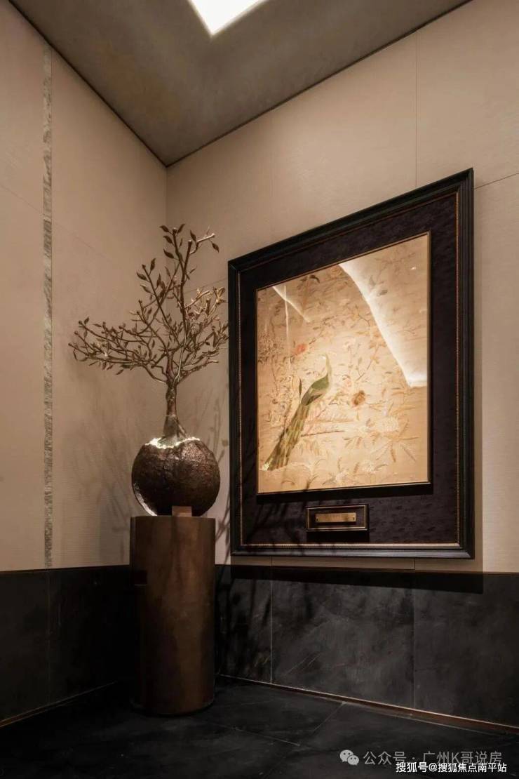 透过中空挂落,日光倾泻而入下方的“金石浮光”的艺术雕塑,阳光与金石肌理交织出细腻的纹理,低调奢华的氛围扑面而来。
