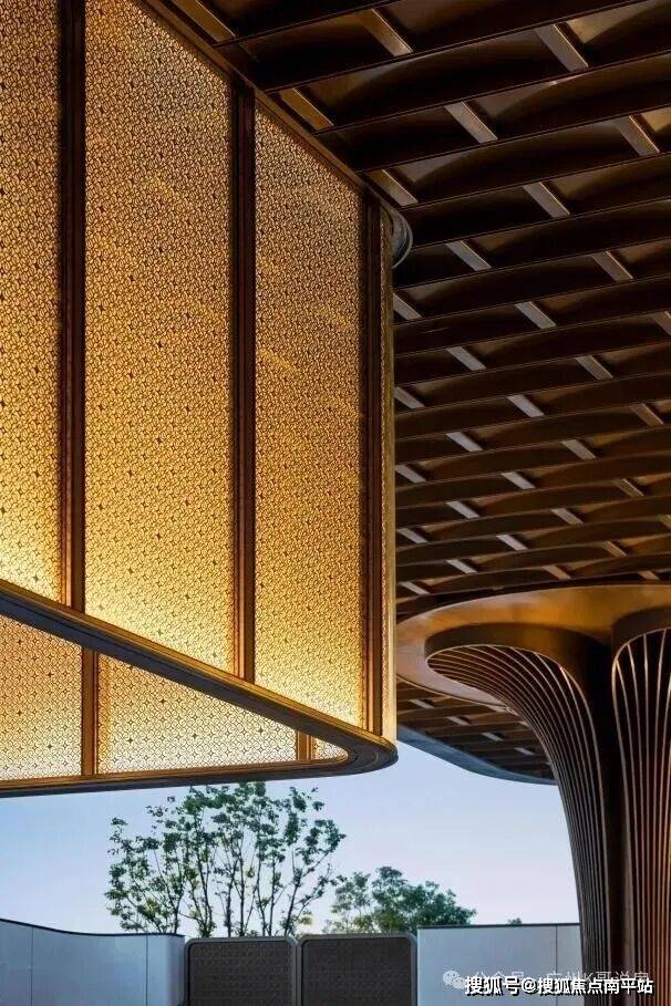 星曜会所的独特从外部空间便已彰显。中国建筑讲究导气,所以就有了“照壁”来阻挡气流,守卫家宅平安。天曜的照壁采用了一种特殊的工艺:电镀金鳞片。