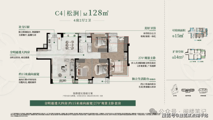 建面约 128㎡户型:边套设计,三面采光,南向面宽约 15 米,含 270° 观景主卧套房及全景 U 型明厨,部分户型配备独立玄关与约 40㎡客餐厅。
