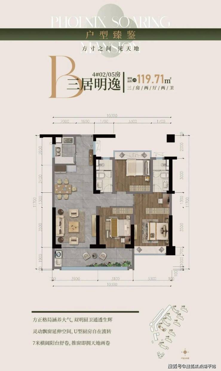建面约 119㎡是经典三居室。LDKB一体化消弭空间边界 ;约7米宽阳台通透 感强;三间卧室位于一侧形成静区;主卧套房设计,配步入式衣帽间、独卫与大飘窗。