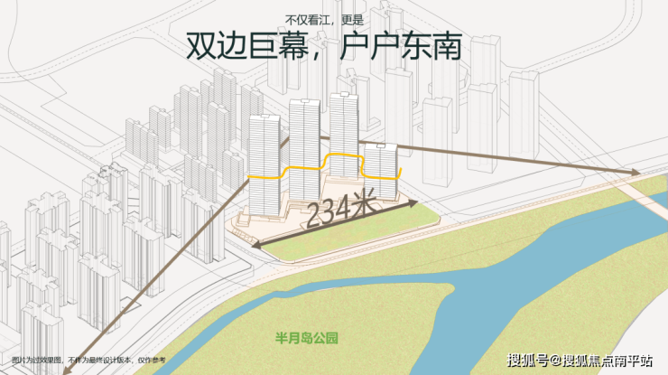 项目可以无遮挡望东平河和半月岛公园,四栋板楼均为东南向,容积率仅为2.5。