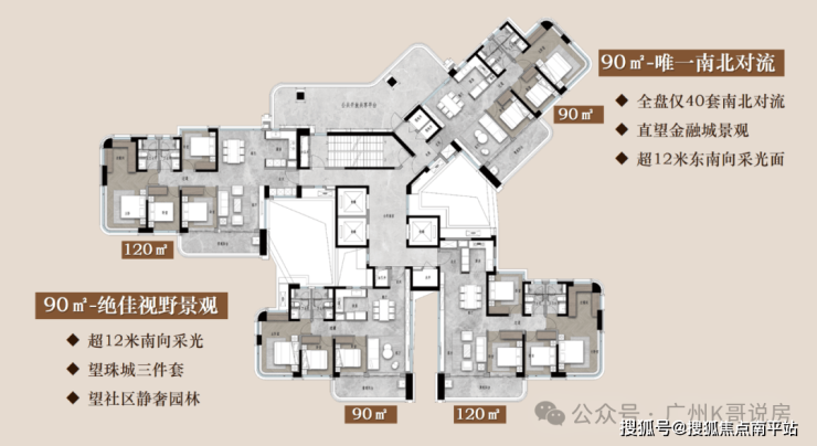 设计好处是既保证了通风、采光,还保障了侧向江景和珠城景观的最大化。