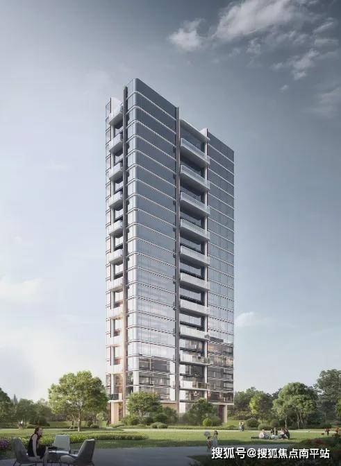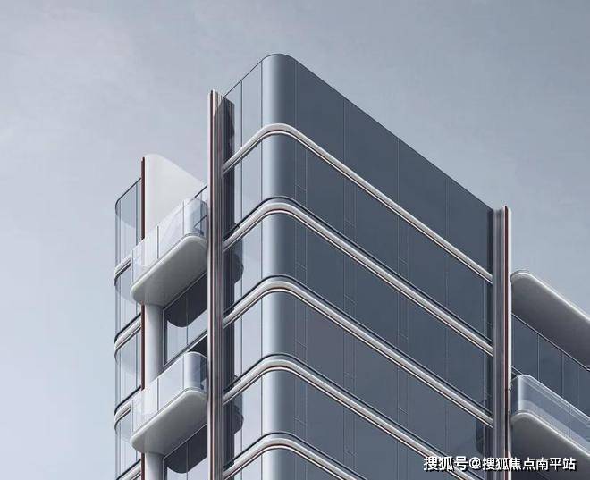高层建筑立面效果图如下,材质以大面积玻璃幕墙为主,加以白色、香槟金色铝板线条修饰。叠加错层露台、圆弧形转角等设计,很是惊艳。