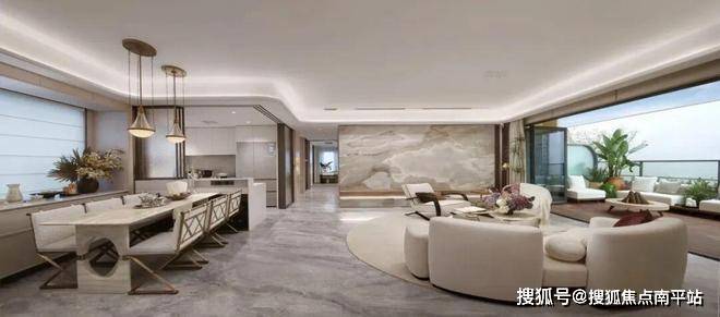 大面积LOW-E玻璃与石材相映, 金属线条勾勒灵动曲线,顶部“天空之翼”舒展大气,搭配米白、浅蓝的自然色调,让建筑成为“会呼吸的艺术品”。 立体山水楼群高低错落,空中光影庭院随日光流转, 复刻“一日之内,光影四时”的诗意,让每一次归家都邂逅东方美学。