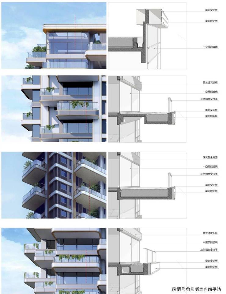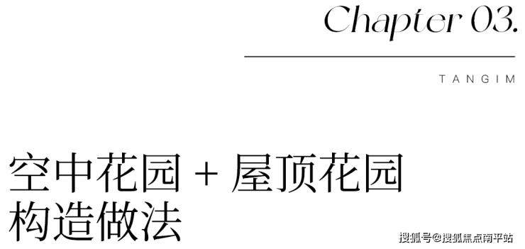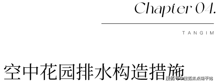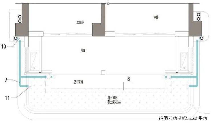 空中花园构建了一种下沉式绿化系统,通过对阳台板结构的转换折板处理,解决种植土壤的流失问题,同时也隐藏了管道转换引起的露明问题,通过侧向转换排水支管,外侧利用装饰线条隐藏横向排水支管,有效解决管道露明的美观问题。