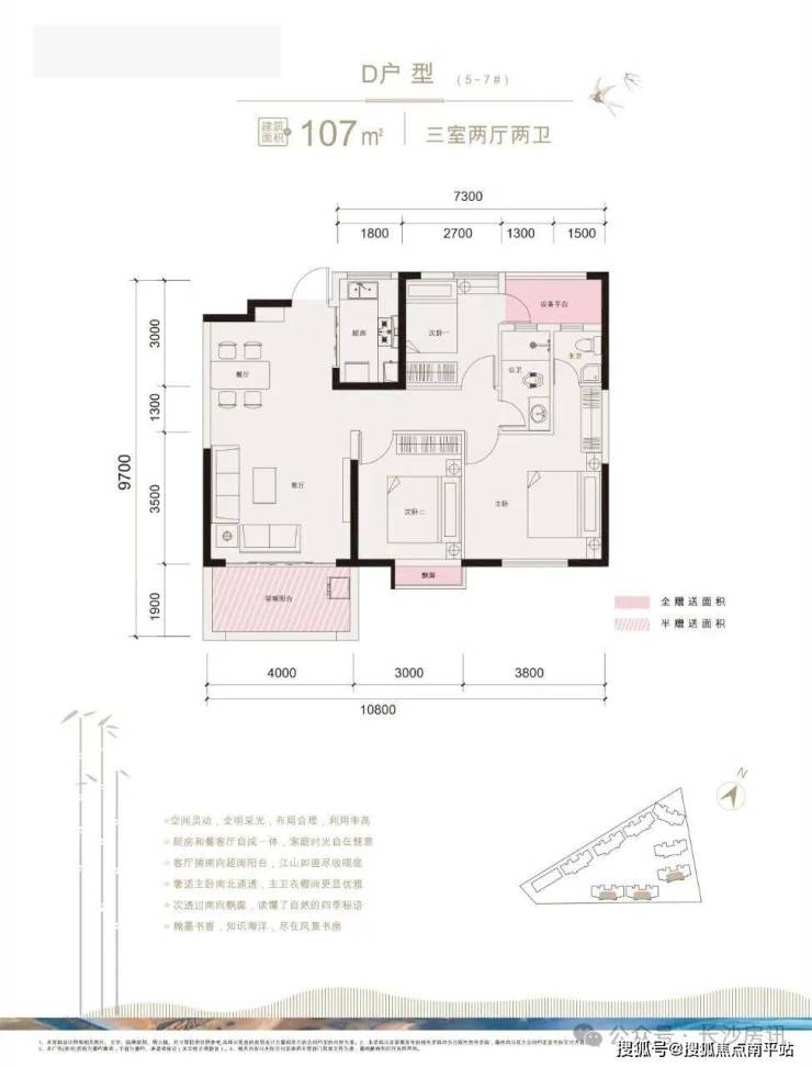 【D户型:建面约107㎡ 三室两厅两卫】·全能三房空间,布局合理,利用率高;·厨房和餐客厅自成一体,家庭时光自在惬意;·客厅拥南向超阔阳台,美景如画尽收眼底;·奢适主卧南北通透,主卫衣帽间更显优雅。