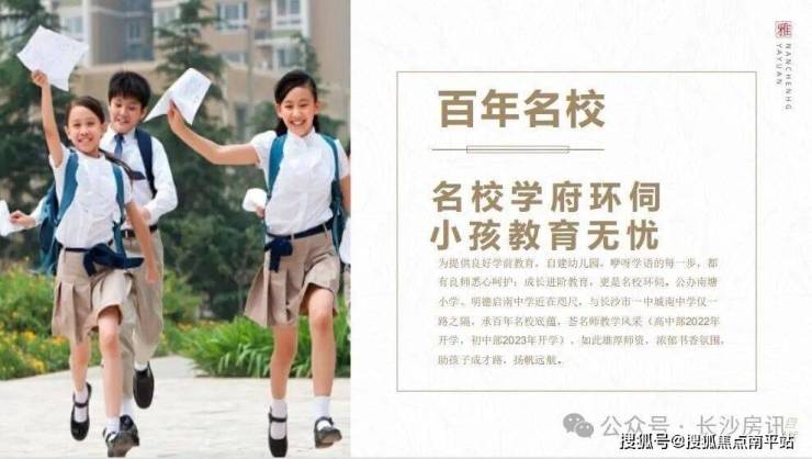 长沙市一中城南中学,承袭了百年名校浓厚的文化底蕴,师资力量、综合实力非常雄厚,在这里入住,您的小孩是能大概率派位到长沙市一中城南中学的。除此之外,项目周围的教育资源也十分齐全,首先,我们项目对面就是长沙市一中城南附属小学(南塘小学),附近还有丰城小学、天心区八局小学,这些都是高质量的公办小学;中学周边有长沙市耀华中学(长沙市优秀民办学校,高中学费13800元/学期;占地58亩,建筑面积40000平方米。现有45个高中教学班级,师生人数达2400余人。)、明德启南中学(公办初中,办学总规模为60个教学班)等众多有实力的学校。完全能够满足您小孩的教育需求。