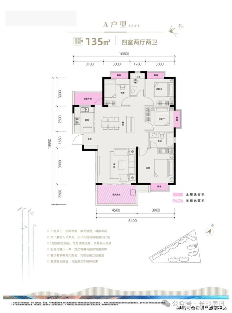 🎁 明星户型:独具匠心设计的灵动 4 居室,这个户型也有三大亮点:①、户型周正,南北通透;②尺度合理135 ㎡实现4房2厅2卫舒适功能布局;③得房率超高,大阳台只计一半面积,三飘窗、设备平台都是不计面积的。