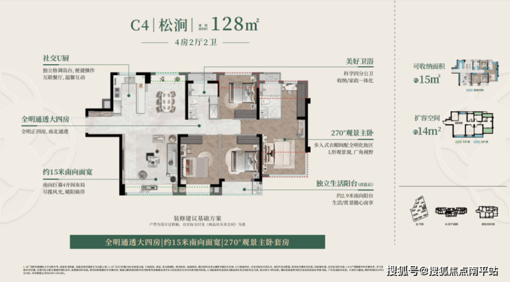 建面约128㎡户型C4户型为全明四房,超15米南向面宽保证全屋通透,U型全景厨房、带L型转角窗的奢享主卧套房,让改善生活的舒适感与仪式感拉满;C5户型则打造约40㎡多变欢聚区,成为家庭互动的核心空间,舒适四房+阔尺主卧套房,兼顾实用与品质;