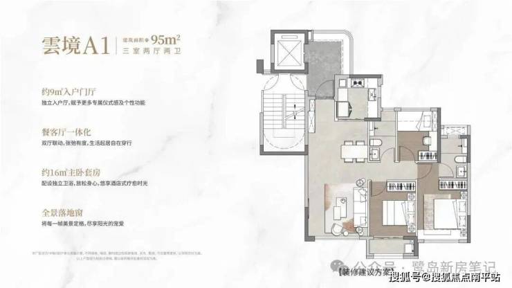 · 95㎡做3房2卫,带独立电梯厅和阳光入户。