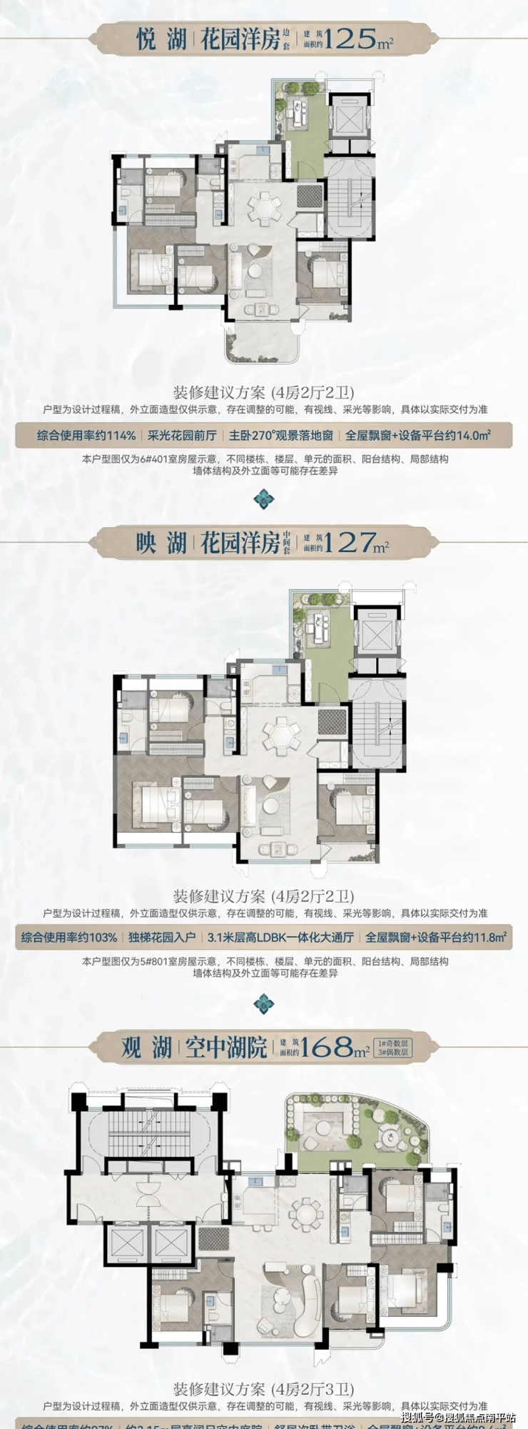 项目容积率仅2.4,户型规划有面积125-127㎡亲湖花园洋房与168-179㎡瞰湖四代宅。