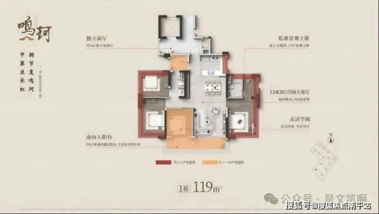 119㎡四房:顺德120㎡内专梯专户,独立电梯厅全赠,四开间朝南,6.9米南向阳台,主卧270°飘窗,刚需预算享改善尺度。
