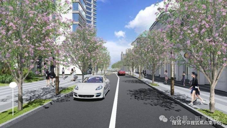 道路两侧种植宫粉紫荆,让街道富有活⼒感和氛围感,同时配有⼩型停⻋场,满⾜居⺠的⽇常停⻋需求。