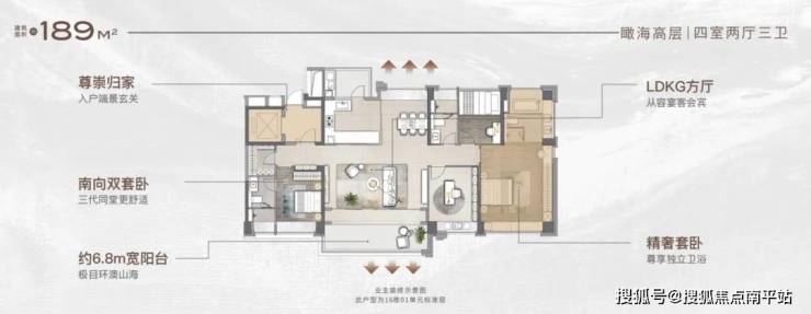 独梯入户,布局仪式玄关,LDK 大厅、漫步式阳台、交互式厨房。超高实得率、270°坏绕巨幕飘窗。