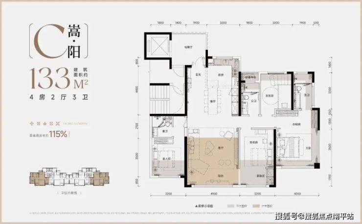 主力面积段100-165㎡三房/四房产品,覆盖刚需和中等改善,3米层高,全封窗,2梯2户,无连廊,私梯入户,得房率(含电梯厅)103-115%,总体配比如下: