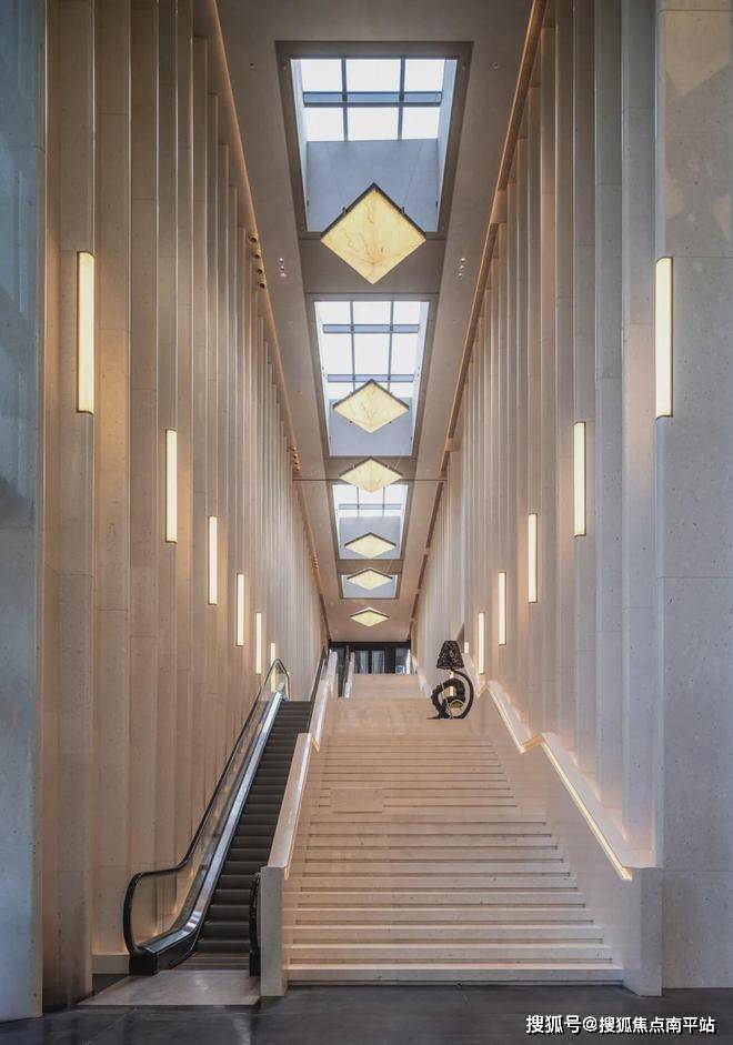 从海派入户旋转门推门而入,看到的是约13-15米的挑高大堂。三层艺术阶梯的进阶之感,层层递进,犹如登山之“径”,气派恢宏。