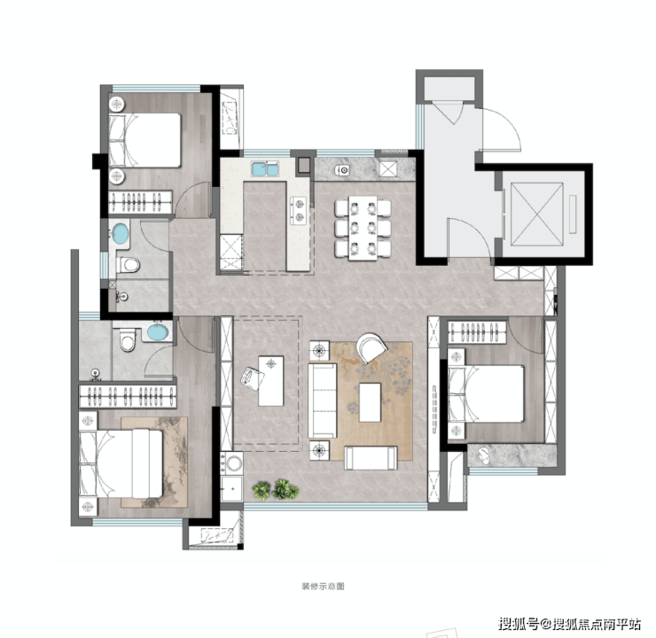 U型厨房+舒适餐厅+南向大横厅,连接双联阳台,形成一个一体化复合厅,在有限的面积里,实现中央生活区最大化;