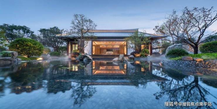 在园林景观的打造上, 复刻王维水墨大作《辋川图》,打造一轴三院六景,朱廊幽径、假山叠石,悬泉飞山,青绿山水画境浑然天成。