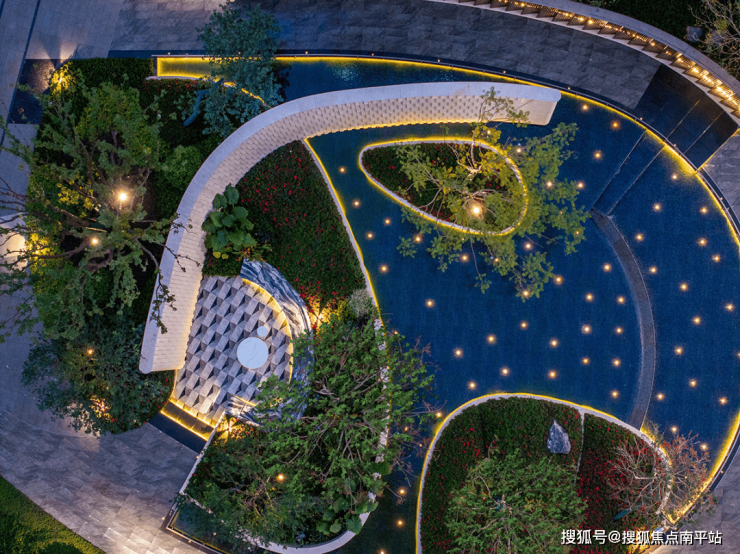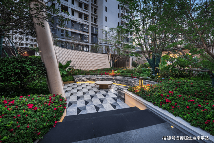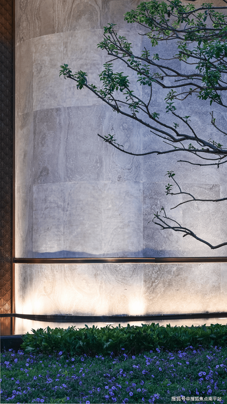 园林内特设由紫山水大理石打造的下沉式休闲卡座,两边拥绿植包裹,于此社交聊天好不惬意,景观错落有致,视觉变化丰富,兼具观赏性与实用性。