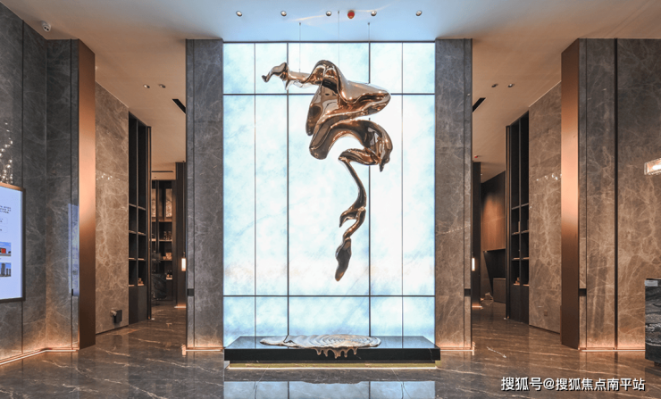 宽约48米的奢阔门庭大气恢弘,搭配铝板密拼精美工艺吊顶、通高透光云石、高定整石安哥拉黑花岗岩环岛水景,以及充分艺术氛围的水景雕塑……打造出气势磅礴的广场空间。