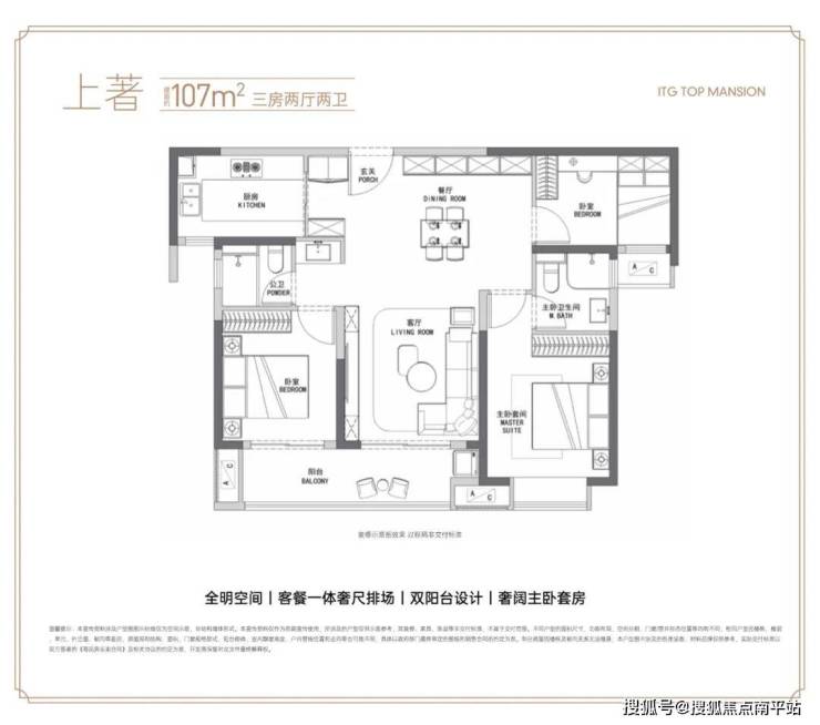 该户型设计三房两厅两卫,为当前市区少有的中小户型,总价可控;三开间朝南设计,多面采光最大化保障室内通透性;餐客厅一体衔接约5.1米阔景阳台,空间延展更显阔绰;主卧带飘窗及独立卫浴,自成一方私密天地,契合三代同堂居住需求,能够满足“首置即改善”需求。