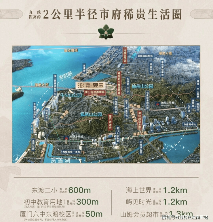 教育资源更是锦上添花。社区自建幼儿园,直线600米即达湖里区重点小学东渡二小,厦门六中高中部仅距50米,规划初中教育用地约300米,12年优质教育链就在家门口。闲暇时,1.2公里内的海上世界、山姆会员店满足购物需求,北倚仙岳山、南揽狐尾山的生态优势,让山海健康步道成为日常散步的后花园。
