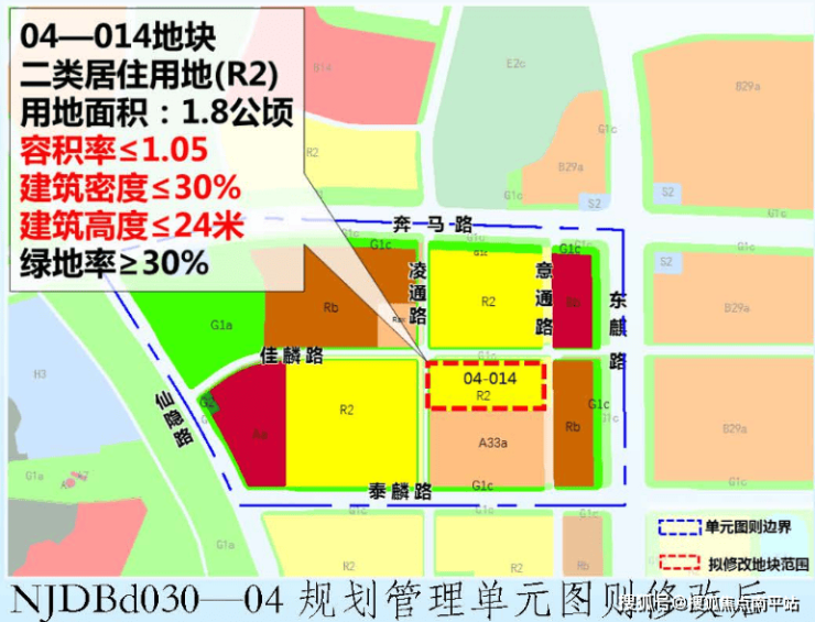 规划修改内容显示,04-014地块二类居住用地(R2)容积率由≤2.0调整为≤1.05、建筑密度由≤20%调整为≤30%、建筑高度由≤60米调整为≤24米,绿地率不作调整。