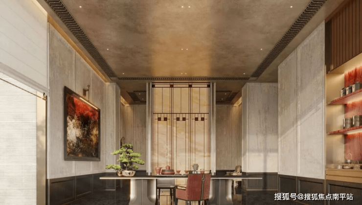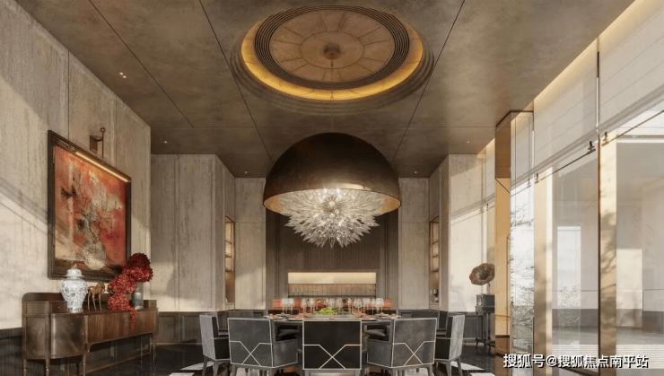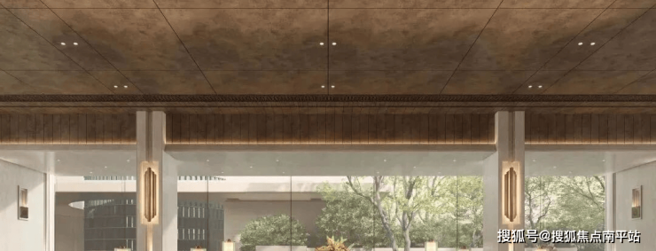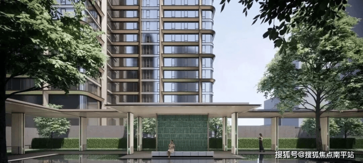 镜面水院倒影建筑美学,风雨连廊串联下沉庭院(叠泉绿台),园林即金融精英的第三会客厅。