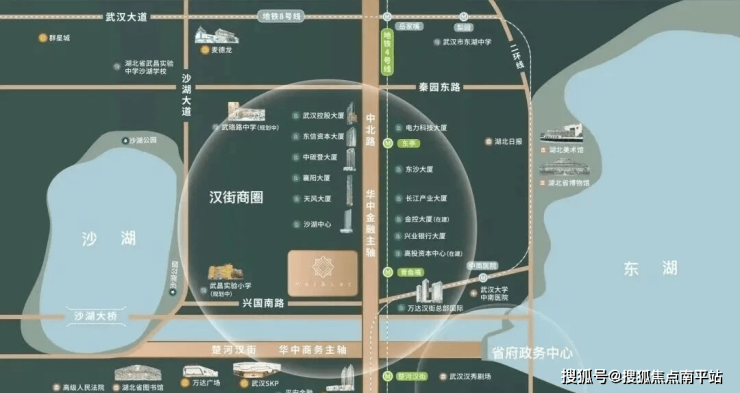 本案向南600米即是武汉唯一重奢店王武汉SKP,1.5KM楚河汉街人潮与中北路资本在此共舞,窗景即顶奢文明棱镜。