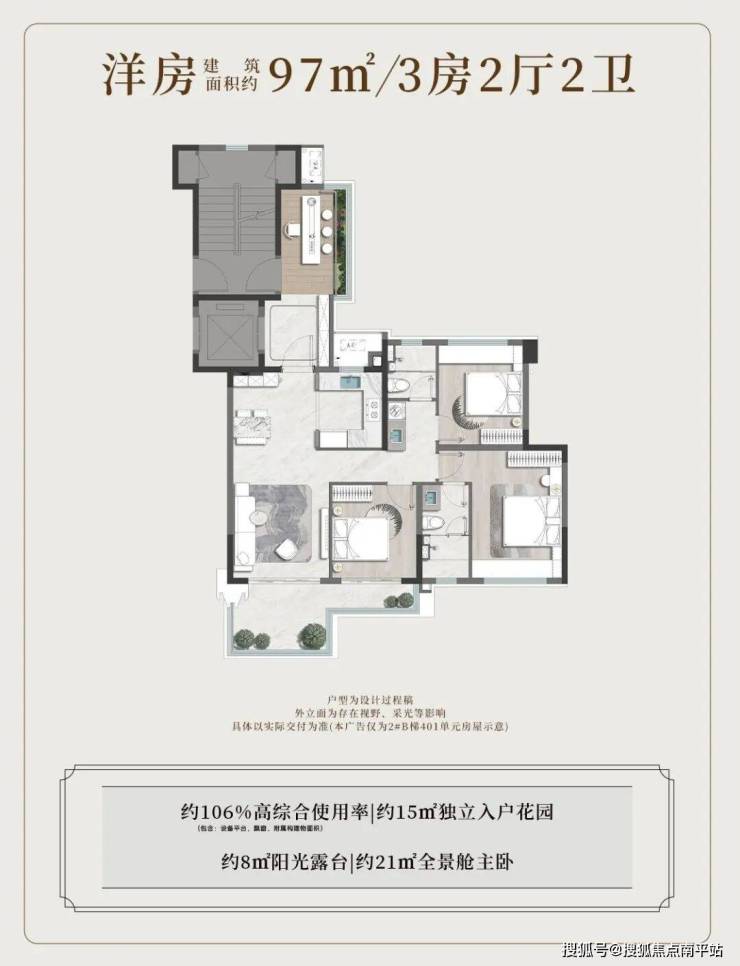 ★97㎡ 3房2厅2卫:入户花园+独立电梯厅,综合使用率92%+;