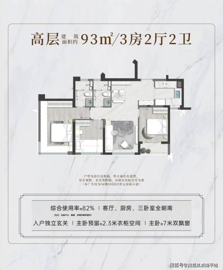 ★93㎡ 3房2厅2卫:三开间朝南,270°飘窗,综合使用率82%;