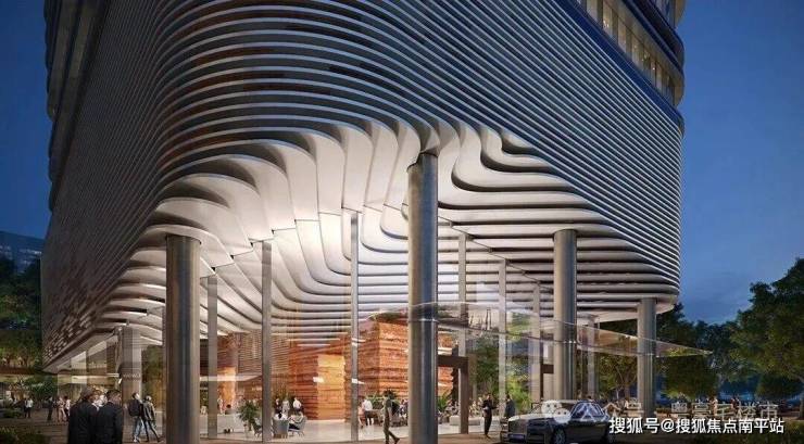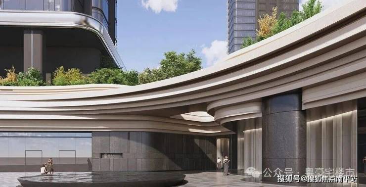 主大堂围绕中心下沉花园布局,搭配艺术环廊,打造兼具仪式感与放松感的归家体验。双大堂设计(步行仪式大堂+交通出行大堂),结合裙房入口悬挑一体化造型,打造高奢酒店式落客尊贵体验。
