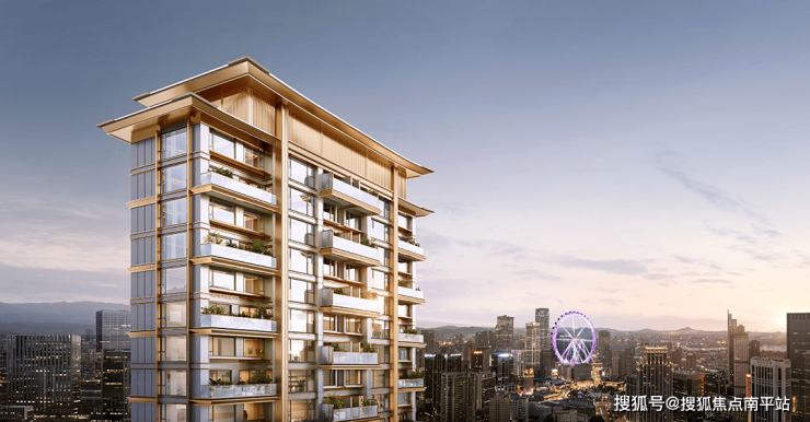 外立面采用迭新宋式飞檐设计,辅以大面积玻璃幕墙与金色铝型材线条,极具辨识度,居住者的品味和身份不彰自显。