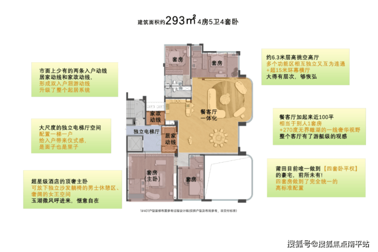 联发建发御湖建面约293㎡户型 私享约 15㎡的独立电梯厅空间, 不同于 常规的密闭入户空间 ,这个户型的入户空间既可以增加储物使用空间。