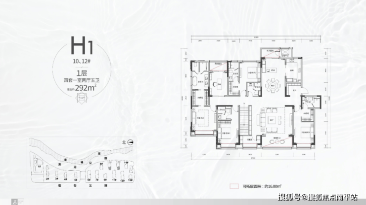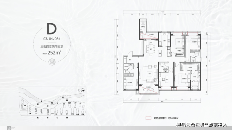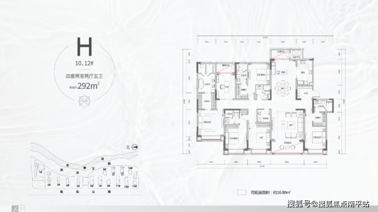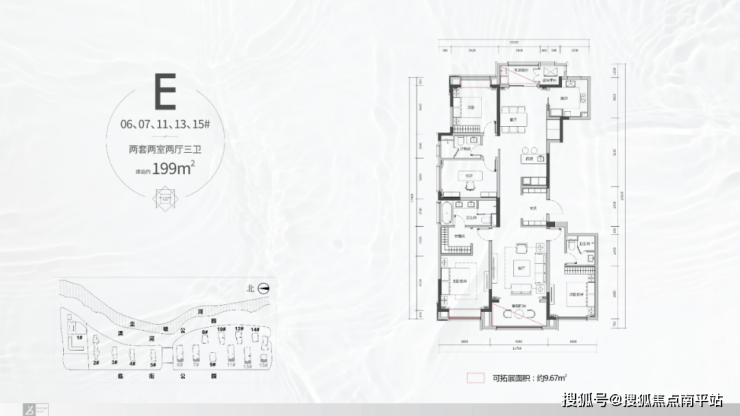 户型方正,得房率高,大面宽短进深,多重阳台、飘窗设计,3.3米层高,最小户型亦配置套房,以大尺度营造高舒适度。