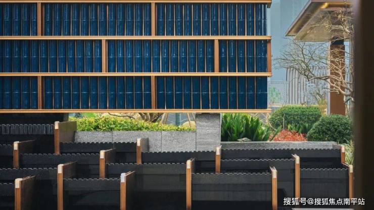 纯手工打造的非遗景墙由半圆形陶瓷柱与不锈钢骨架编织而成,状似金镶玉,每一根陶瓷柱在阳光下都有着独一无二的机理表现,仿佛将水的流动质感凝固在陶瓷之上;