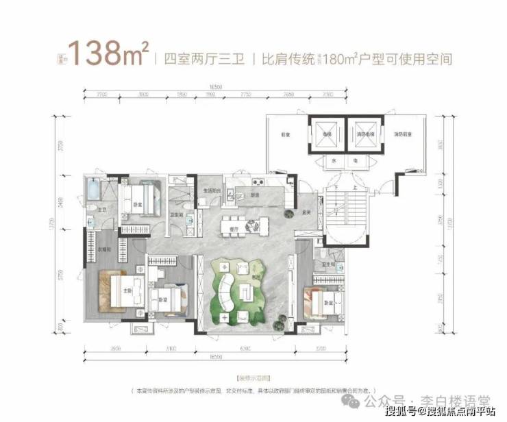 另有 约181㎡大平层户型 ,超17米大面宽、客厅开间接近7米,尺度奢阔;其余布局与138㎡户型类似,大空间感更强,适合预算足的高阶圈层!