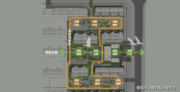 景观设计围绕“循声入林·鸿影纷飞”核心主题,营造整体和谐且各有特点的居住空间。