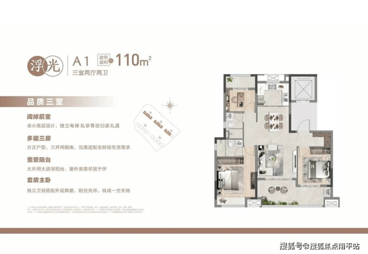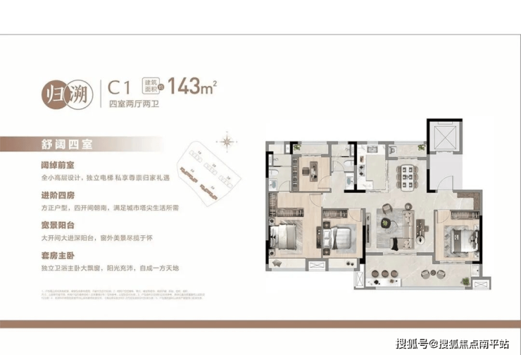 主推 110㎡三房和 143㎡四房户型,110㎡三房做到双卫设计,主卧带独立卫浴。143㎡四房设置独立家政间,主卧与次卧均带独立卫生间,动静分区合理,居住舒适度高。