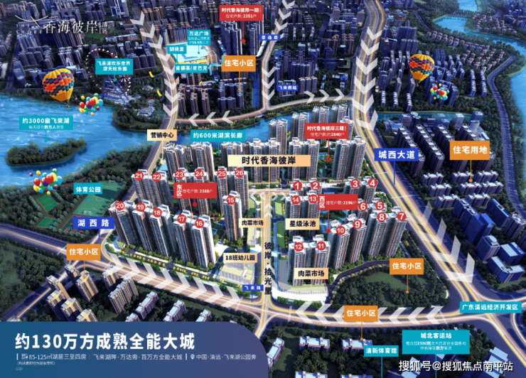 时代香海彼岸坐落于飞来湖湖畔,一侧,隔一条市政路,不过10米,就是万达广场。