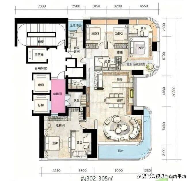 一层两户,经典大平层:约303㎡主力户型,空间布局方正大气,功能完备。