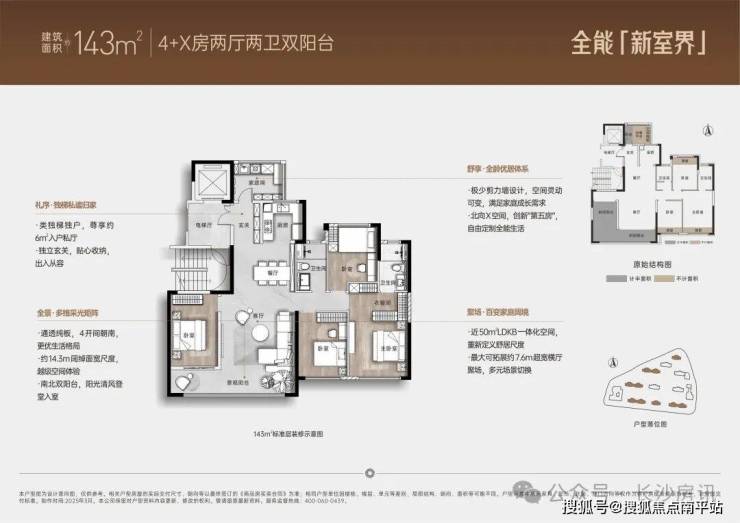 建面约143㎡ 全能「新室界」4+X 房两厅两卫双阳台◆ 打造四开间朝南、可拓展的超大横厅,灵动百变定制全能生活。