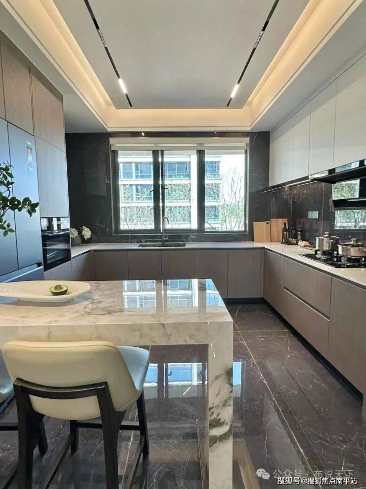 负一层大堂约3.5-4米挑高, 全部采用大面积岩板+不锈钢装饰,满满奢宅感。