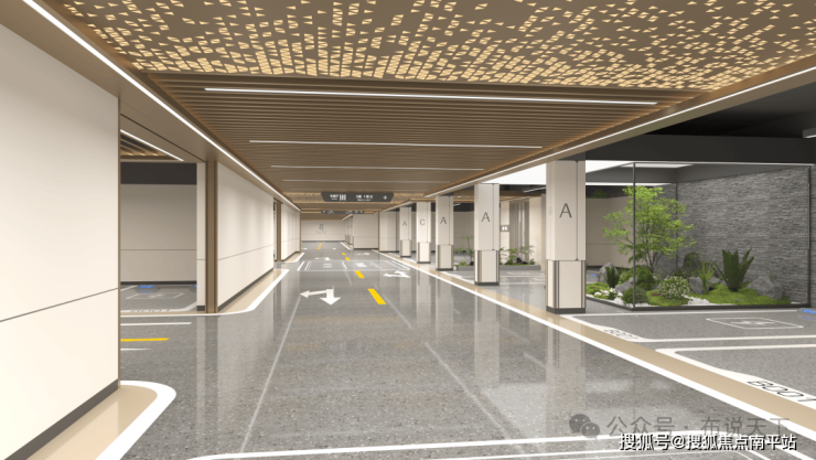 坡道采用 运达式小块石材铺装,迎宾感应式灯带,加宽车道铝格栅密缝吊顶,两侧采用大面积铝板围护,净空2.4米,呈现质感与空间感兼备的归家空间。