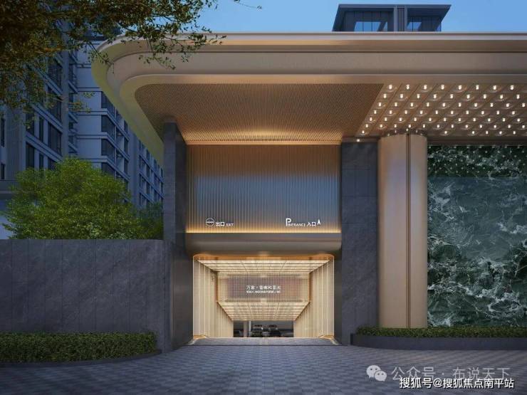 酒店级双入户大堂,首层大堂采用干挂石材+铝板雨棚,颇具高门阔府既视感,内部约6米挑高。