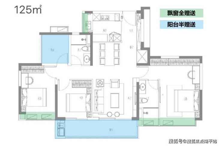 125㎡四房两卫,约12.5㎡赠送面积,约6.7m双面宽阳台,约30㎡奢享型主卧。