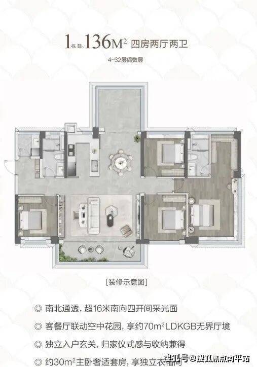 建面约136㎡4房2厅2卫,更是实现南向四开间超16米大面宽,并通过南北通透的客、餐厅、景观阳台、露台构建出空气流通与光线穿透的开阔感。